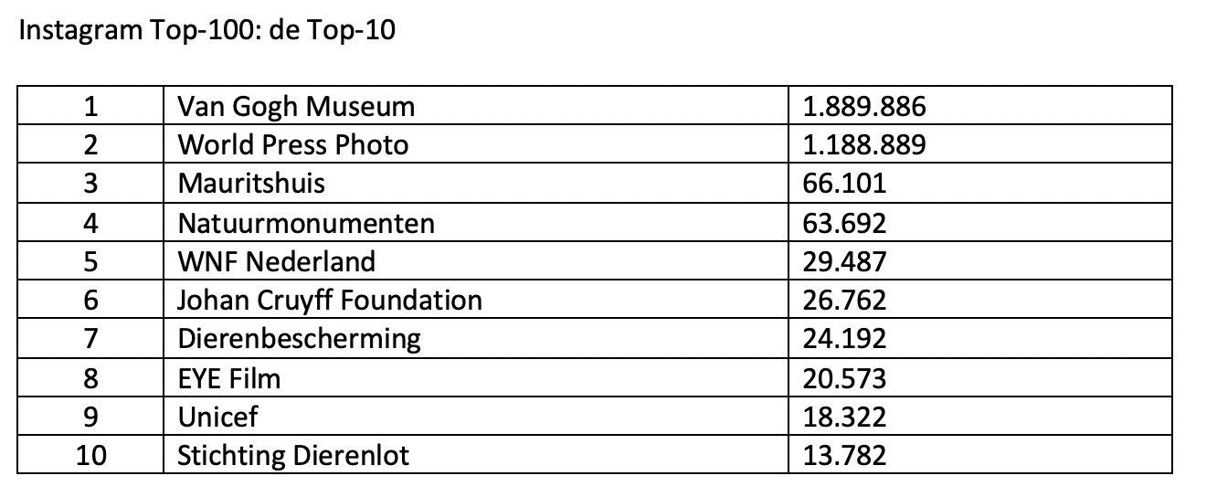 De Instagram Top 100 van Fundraiser Online heeft een nieuwe nummer 1: het account van het Van Gogh Museum is World Press Photo voorbijgestreefd. Beide organisaties genieten internationale bekendheid en staan mijlenver voor op de rest van de accounts in de lijst. Ook de accounts van andere organisaties groeien onverminderd hard door, aldus het platform dat volgersaantallen van goede doelen-accounts bijhoudt.