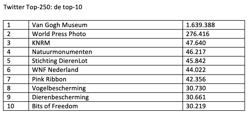 Natuurmonumenten deed het ook op Twitter goed. De organisatie is hard op weg om ook hier plek drie over te nemen en stijgt naar de vierde plaats ten koste van DierenLot. Verder stijgt de Vogelbescherming naar plek acht in de lijst, waarmee het de Dierenbescherming en Bits of Freedom voorbijstreeft (allen meer dan 30.000 volgers).