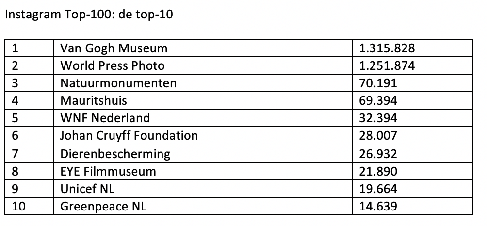 De ondergrens om opgenomen te worden in de lijst steeg van 1088 naar 1242 volgers. In de top-10 veranderde er weinig. Natuurmonumenten beleefde een goed kwartaal en steeg sneller dan het Mauritshuis, waardoor de natuurorganisatie zichzelf nu ‘best-of-the-rest’ mag noemen. Het account van Greenpeace Nederland vestigt zich met bijna 15.000 volgers bij de bovenste tien en drukt Dierenlot terug naar plaats elf. Een eervolle vermelding gaat naar Mama Cash, die van plek 47 naar 23 stijgt.
