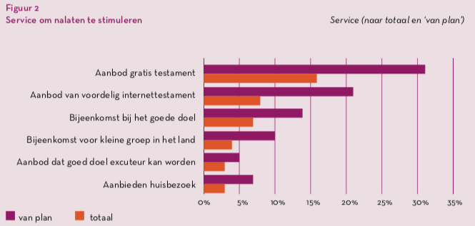 De respondenten konden zich ook uitspreken over welke diensten ze interessant vinden. Daarbij scoren gratis testamenten, goedkope internettestamenten en voorlichtingsbijeenkomsten hoog. Een kleinere groep ziet meer in een persoonlijk gesprek of het benoemen van een goed doel als executeur. Maar de mensen die openstaan voor nalaten aan een goed doel zijn positief over die services. Fondsenwervende instellingen doen er goed aan een mix van die diensten aan te bieden. Zie figuur 2.