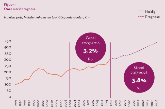 In 2016 waren de inkomsten uit nalatenschappen voor heel veel goede doelen substantieel hoger dan in voorgaande jaren. Nalatenschappen zijn een zeer belangrijke bron van inkomsten geworden voor goededoelenorganisaties. De honderd grootste ontvingen in 2016 € 311 miljoen via testamenten, tegen € 270 miljoen in 2015. Nalatenschappen waren goed voor 27 procent van de inkomsten uit eigen fondsenwerving. Dat aandeel was in 2015 nog maar 21 procent. Tussen 2007 en 2016 zagen de top 100-ontvangers hun inkomsten uit nalatenschappen groeien met gemiddeld 3,2 procent per jaar, in de periode 2006-2015 bedroeg dit nog 2,6 procent per jaar.